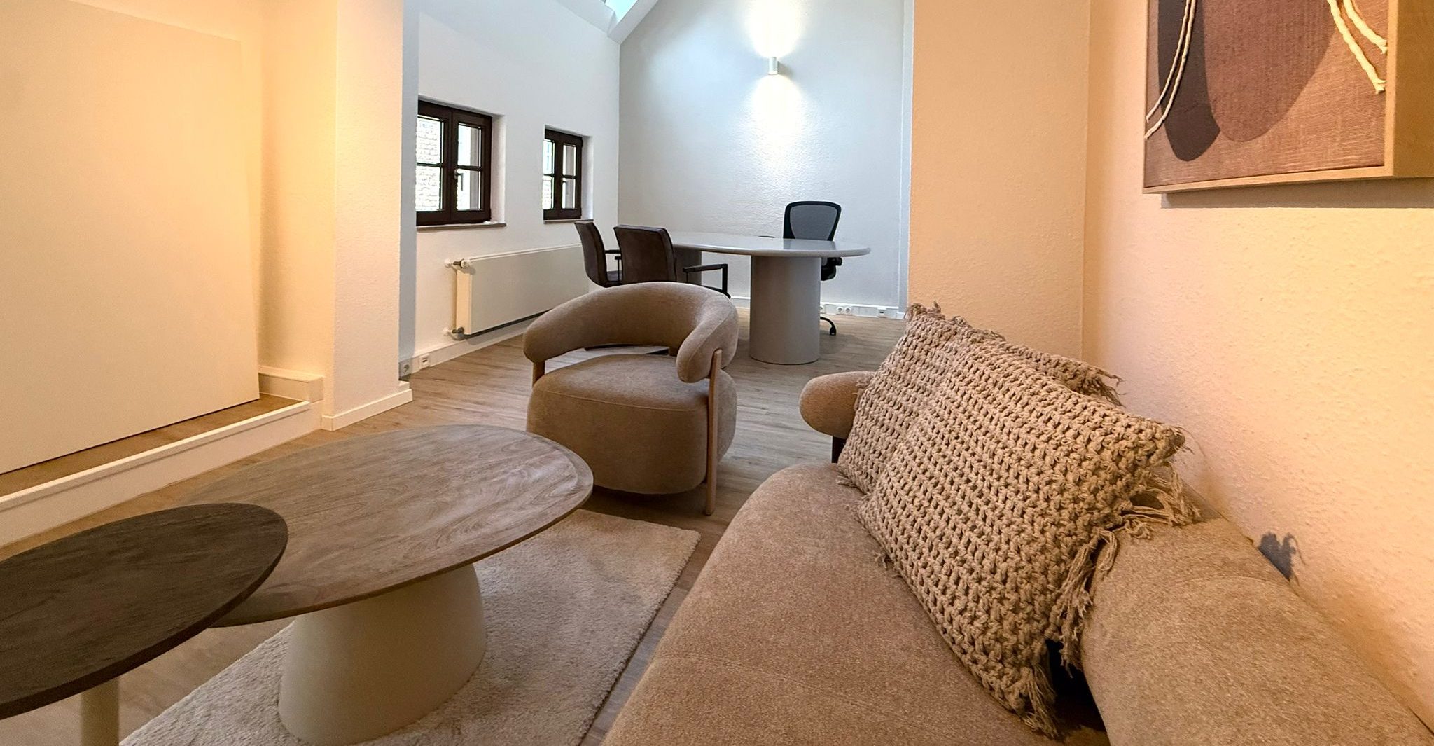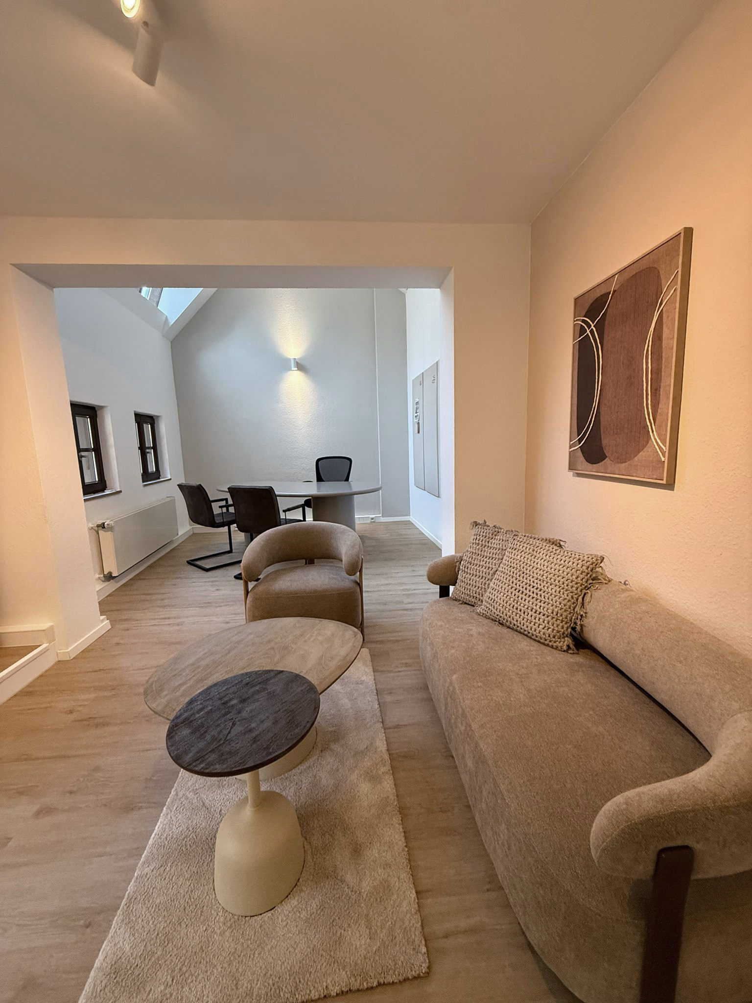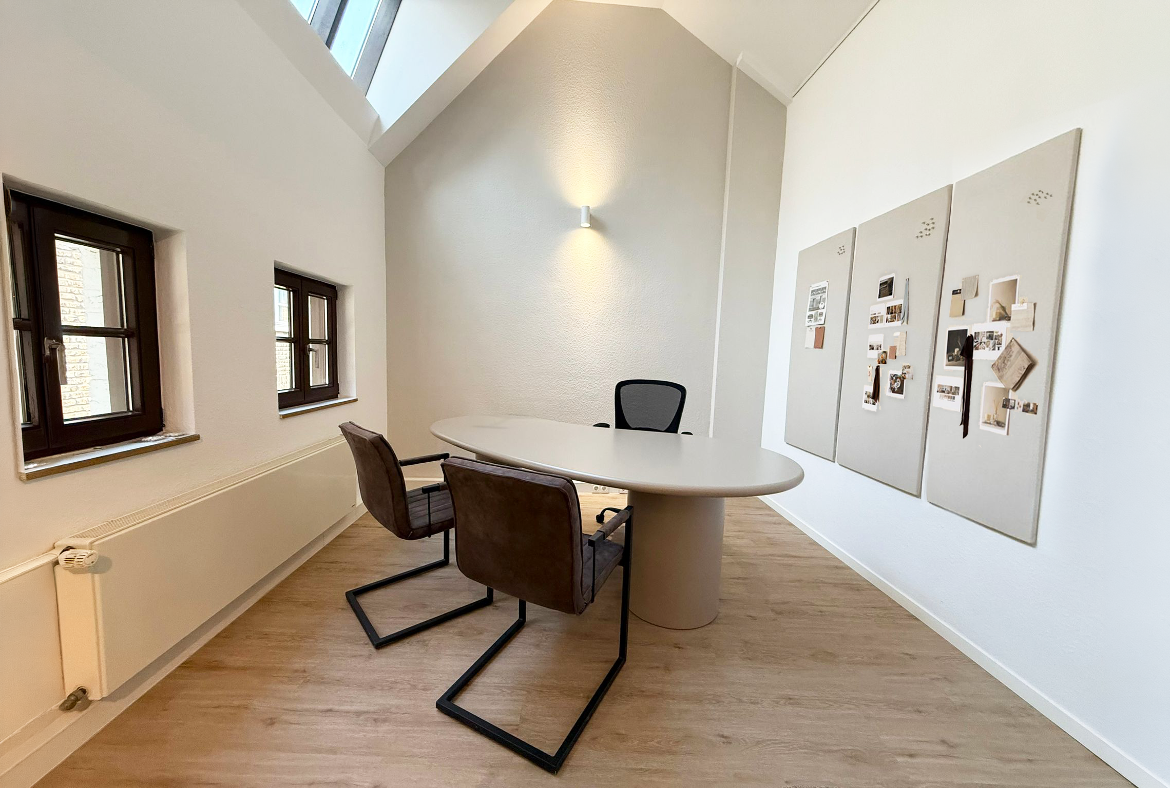 Ideal für Teams, Workshops und kreative Arbeitsphasen. Der Raum kombiniert eine warme, entspannte Atmosphäre mit funktionaler Ausstattung: Perfekt für produktive Zusammenarbeit und Ideenentwicklung. Ein komfortables Sofa schafft eine lockere Gesprächssituation, während das XXL-Board zum Pinnen und Visualisieren optimale Bedingungen für Brainstormings und Projektplanung bietet.